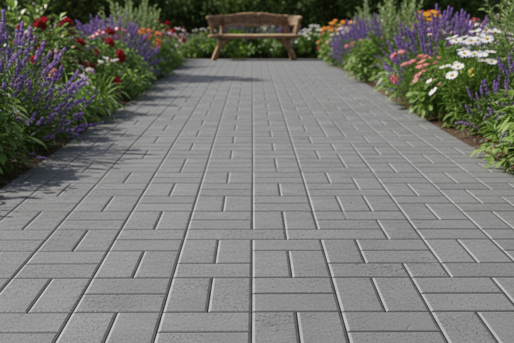 Pavers are aligned in straight, even rows for a modern, grid-style look. Best for low-traffic areas and contemporary outdoor designs.