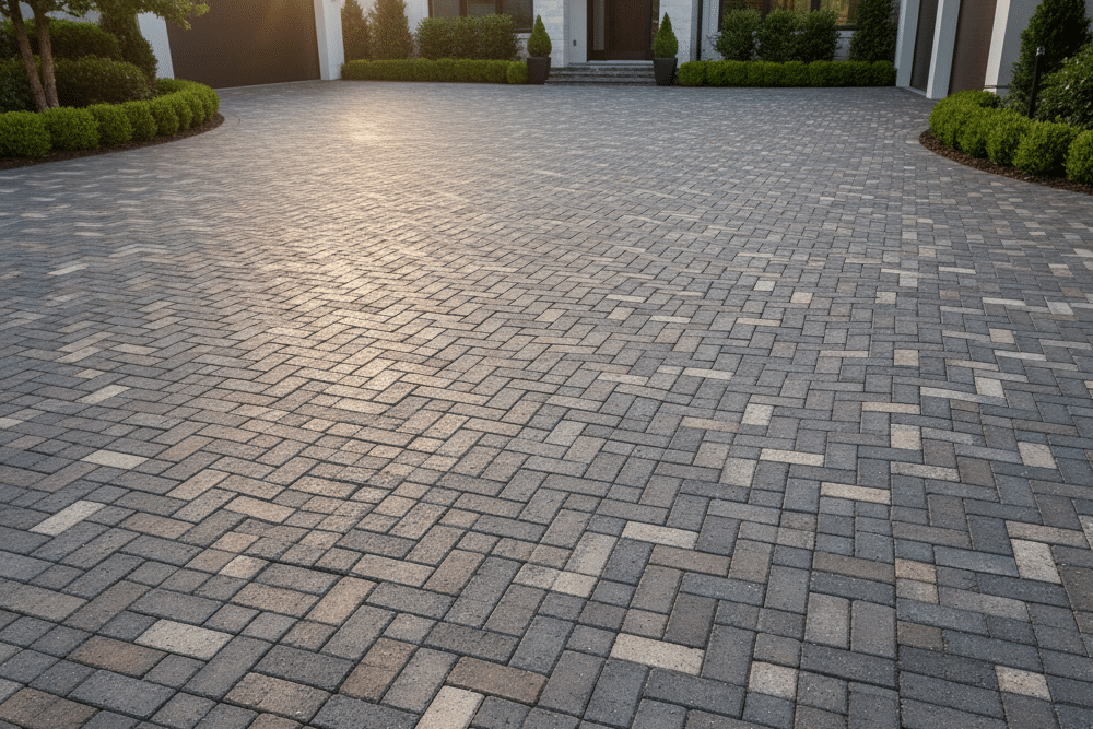 Pavers are laid at 45° or 90° angles in a zig-zag design. It’s one of the strongest layouts, perfect for driveways and high-traffic areas.